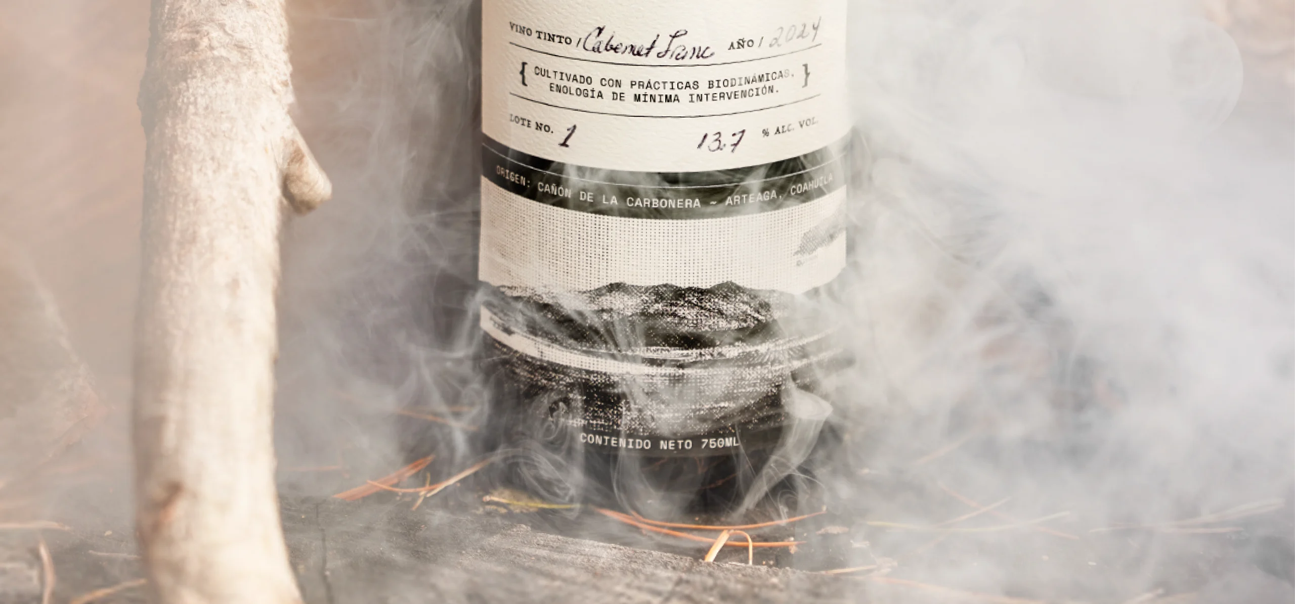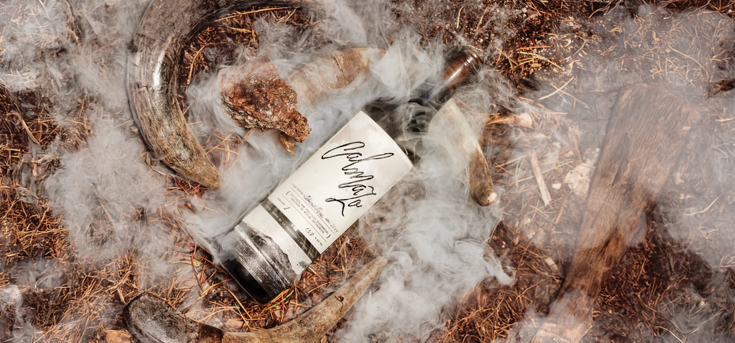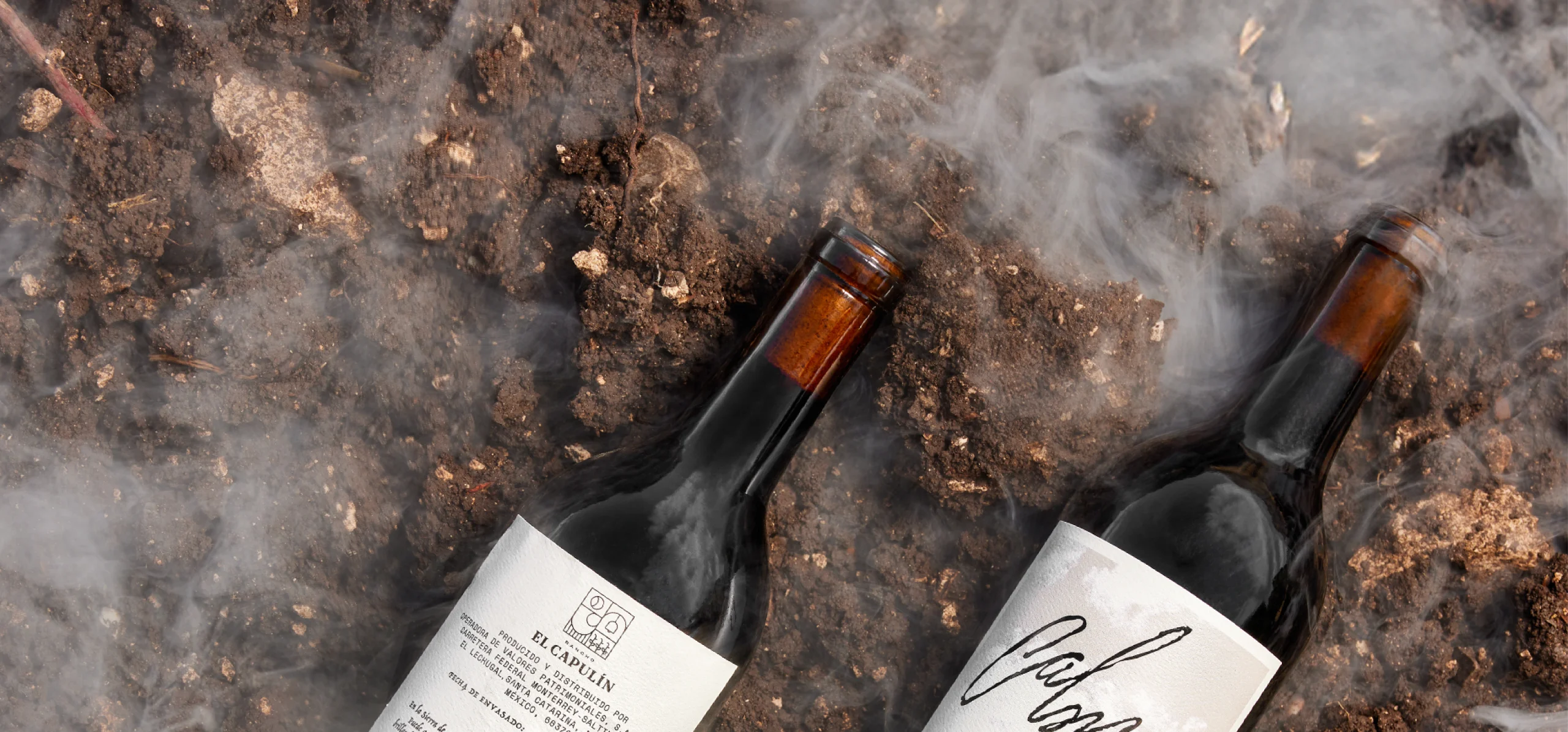 On the label, the large, black, glossy logotype appears as the main element, contrasting with the soft clouds in the background. At the bottom, a photograph of the ranch’s mountain landscape is integrated, intervened with graphic elements inspired by vintage negatives, placing the wine in the Cañón de la Cabronera, surrounded by mountains and defined by its ecosystem, which gives it that distinctive sepia tone.
